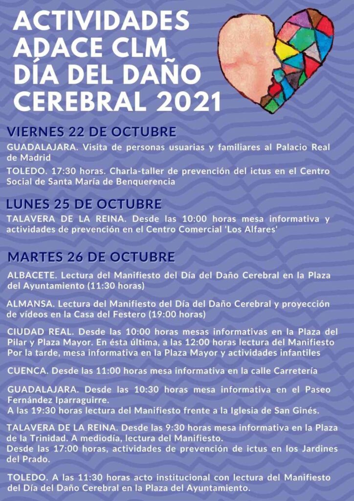 La Asociación de Daño Cerebral Sobrevenido de Castilla-La Mancha (ADACE CLM) recuperó este año las actividades presenciales en distintas ciudades de la región para celebrar el Día del Daño Cerebral, que se conmemora el próximo martes 26 de octubre, y en el cual muchas localidades se iluminarán de azul esa tarde-noche para llamar la atención acerca de la discapacidad que afecta a cerca de medio millón de personas en España, 20.000 de ellas en la Comunidad Autónoma.