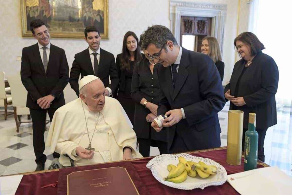 El ministro de la Presidencia, Félix Bolaños, ha obsequiado al Papa con varios productos del campo español en el encuentro que han tenido este lunes, entre ellos azafrán de la localidad toledana de Villafranca de los Caballeros (Denominación de origen La Mancha); dos botellas de aceite de oliva de dos cooperativas de Jaén y plátanos de La Palma.