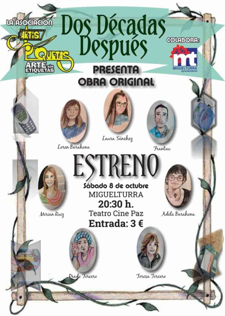 La obra de teatro “Dos décadas después” será representada por la Asociación “Arte sin etiquetas” el sábado 8 de octubre a las 20:30 horas en el Teatro Cine Paz de Miguelturra (Ciudad Real). Esta es una actividad cultural realizada con la colaboración del área de Cultura del ayuntamiento local. La entrada tiene valor de 3 euros.