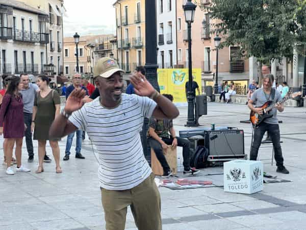 El cantante de soul Clarence Bekker ha sorprendido este jueves a los viandantes de la plaza de Zocodover con un concierto sorpresa. Es uno de los platos fuertes del Festival Internacional de Jazz ‘Ciudad de Toledo’ que actuará mañana viernes con su banda en la plaza del Ayuntamiento, epicentro de este evento cultural que se prolongará hasta el 11 de septiembre.