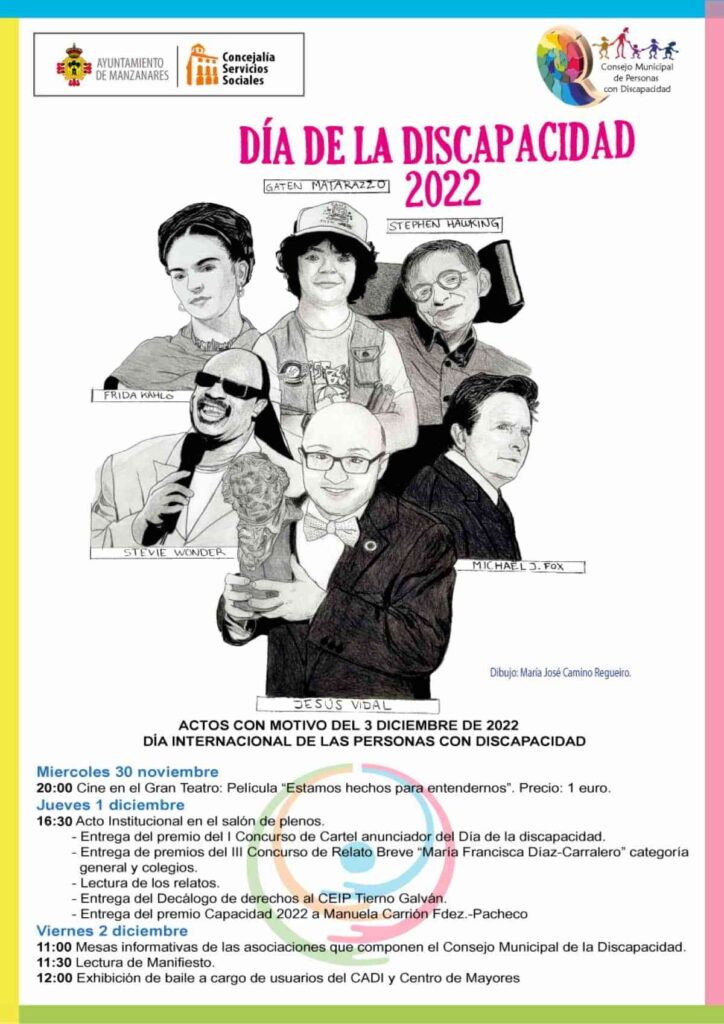A las 16:30 horas, el salón de plenos acogerá el acto institucional, que comenzará con la entrega de premios del I concurso del cartel anunciador del Día de la Discapacidad a María José Camino y del III concurso de relato breve ‘María Francisca Díaz-Carralero’.