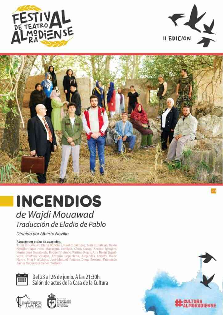 Abrirá el Festival los días 23, 24, 25 y 26 de junio, la obra “Incendios” de Wajdi Mouawad, traducida por Eladio de Pablo, una obra clave del teatro del siglo XXI, que habla de ese renacer, de los fuegos que, a veces hay que sembrar, del temible camino que, a menudo, hace falta recorrer para llegar a uno mismo. Cuenta la historia de Nawal Marwan que fallece tras años de inquebrantable silencio dejando dos sobres a sus hijos gemelos. Estos iniciarán una búsqueda que les llevará de regreso a su país de origen, una tierra erosionada por la barbarie y el dolor que produjo la guerra.