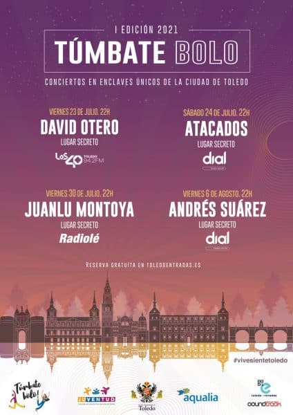 Las invitaciones se pondrán a disposición del público, con preferencia para los empadronados en Toledo de entre 16 a 30 años, el lunes previo a cada espectáculo en la web: www.toledoentradas.es/tumbatebolo. Este ciclo de conciertos ha sido organizado por el Ayuntamiento de la capital en colaboración con la Cadena Ser a través de sus emisoras musicales -Los40, Radio Olé y Cadena Dial- y el patrocinio de la empresa Aqualia.