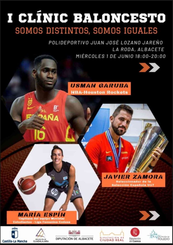 La Ruta Garuba Castilla-La Mancha: Somos Iguales, somos distintos’ se basa en una docena de Clínics de baloncesto que van a celebrarse en distintos puntos de la Comunidad Autónoma de la mano de Usman Garuba, actual jugador NBA de los Houston Rockets, que participará en el evento que el miércoles llegará a La Roda con Javier Zamora (entrenador de la Selección Española U17) y María Espín (capitana del equipo Movistar Estudiantes de la Liga Endesa femenina).