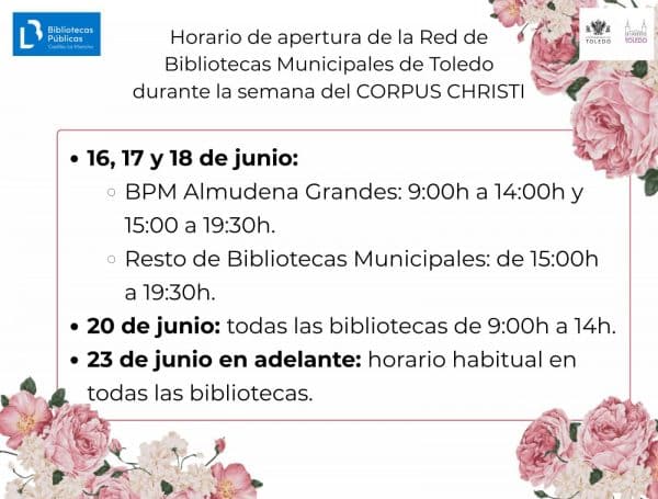 Con motivo de la celebración de la Semana del Corpus Christi, las Bibliotecas Municipales de Toledo realizarán ajustes en sus horarios de atención al público. Esta modificación temporal busca permitir que tanto el equipo de trabajo como los visitantes disfruten plenamente de las actividades y eventos programados en la ciudad durante esta festividad.