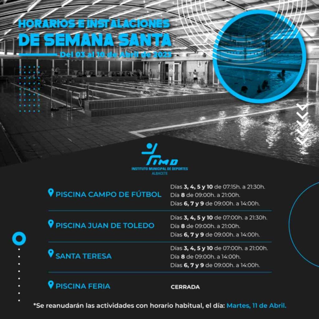 Tomar nota del horario en piscinas y salas de musculación de Albacete durante los días de la Semana Santa 2023. Las actividades se reanudarán en horario habitual, el martes 11 de abril.