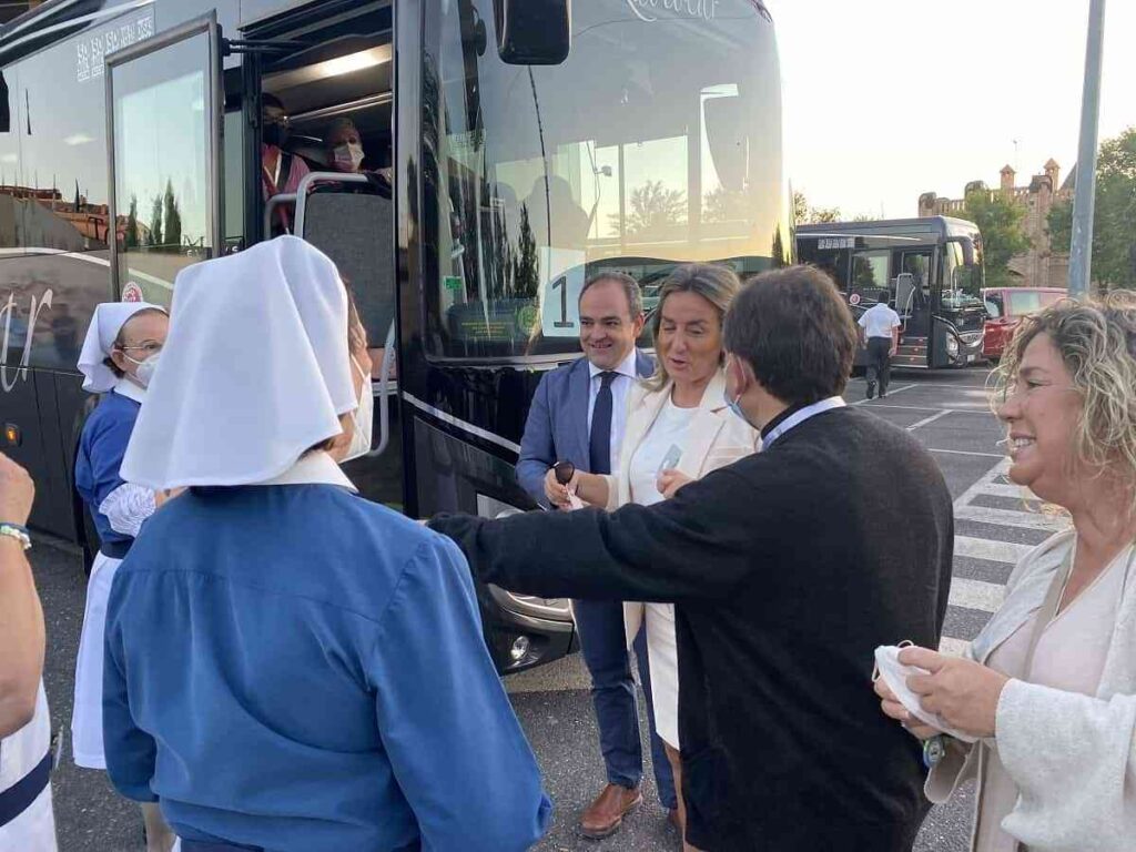 La alcaldesa de Toledo, Milagros Tolón, se ha acercado a primera hora de la mañana a las inmediaciones de Toletum para despedir a los toledanos y toledanas que participan en la peregrinación anual de la Hospitalidad Nuestra Señora de Lourdes de Toledo. Unas 500 personas en 12 autobuses conforman la comitiva que partía hoy y que permanecerá en el santuario francés hasta el 2 de julio.