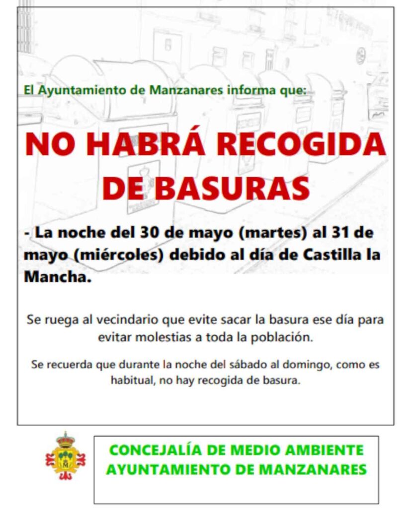 Según la concejalía de Medio Ambiente del Ayuntamiento de Manzanares (Ciudad Real), durante la noche del 30 al 31 de mayo no habrá servicio de recogida de basuras debido a la celebración del Día de Castilla-La Mancha. Por lo tanto, se solicita la colaboración de los ciudadanos para que no saquen su basura esa noche, con el objetivo de evitar molestias a los vecinos. Es importante recordar que los sábados no se realiza la recogida de basuras, por lo que se debe prestar especial atención a la gestión de los residuos durante este fin de semana. La información ha sido proporcionada por el Ayuntamiento de Manzanares y publicada en el Diario de Castilla-la Mancha.