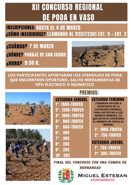 El certamen dará comienzo a las 9:30 horas en la Pradera de San Isidro y está organizado por la Concejalía de Agricultura del Ayuntamiento de Miguel Esteban. El objetivo de esta iniciativa es poner en valor el trabajo del agricultor, la tradición vitivinícola del municipio y la importancia de las técnicas de poda en vaso, claves para garantizar la calidad y el futuro de los viñedos.