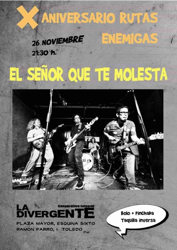El programa de radio libre Rutas Enemigas, que se emite todas la semanas desde Onda Polígono Toledo, celebrará el próximo sábado, 26 de noviembre, su décimo aniversario en la capital regional con la actuación del grupo madrileño ‘El señor que te molesta’.