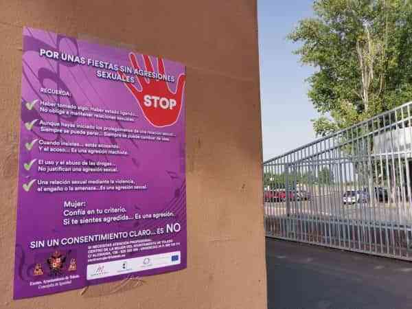 A primera hora de la mañana han recorrido el recinto para distribuir los carteles diseñados para esta ocasión en los que se recuerda que: “Haber tomado algo. Haber estado ligando. No obliga a mantener relaciones sexuales”; “Aunque hayas iniciado los prolegómenos de una relación sexual…Siempre se puede parar…Siempre se puede cambiar de idea”.