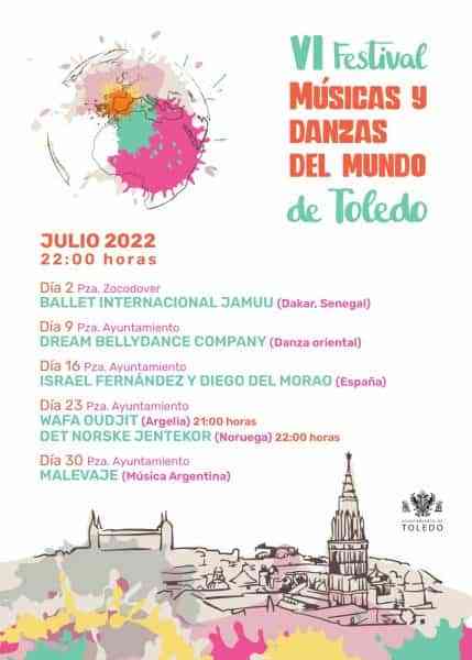 Las actuaciones se iniciarán el 2 de julio, en la plaza de Zocodover a las 22:00 horas, con el Ballet Internacional Jummu, de Dakar, Senegal. Un espectáculo de danzas senegalesas que muestra las profundas raíces de la tradición artística y cultural de África, a través de emociones y sensaciones producidas por los vibrantes sonidos, ritmos y colores sobre un escenario con treinta bailarines y músicos capaces de combinar bailes acrobáticos con músicas profundas, mediante coreografías de danza contemporánea.