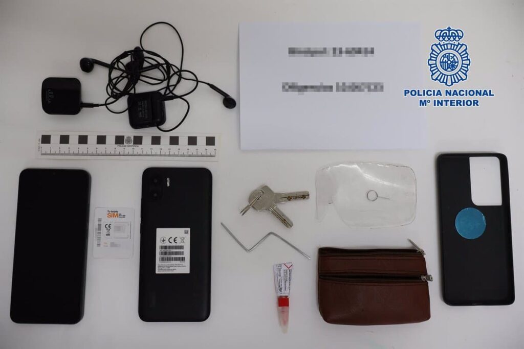 Los agentes que patrullaban la zona en un vehículo encubierto llegaron rápidamente al lugar y lograron localizar a los sospechosos. Posteriormente, se desplazaron tres patrullas más, y al registrar las pertenencias de los detenidos encontraron diversos objetos que presumiblemente iban a ser utilizados en los robos. Entre ellos se encontraban plásticos, alambres tipo ganzúa, llaves de «bumping», auriculares bluetooth y botes de pegamento.