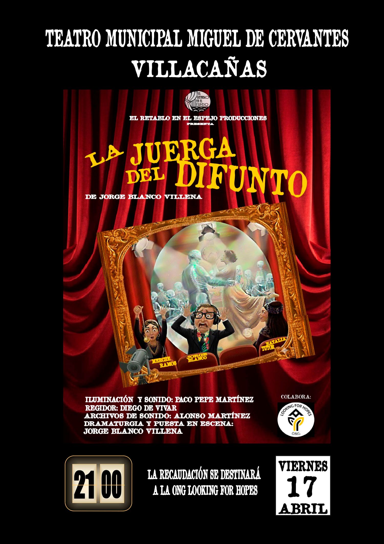 La localidad toledana de Villacañas celebrará este viernes una cita cultural con carácter solidario gracias a la representación de la comedia La Juerga del Difunto, cuya recaudación se destinará íntegramente a la ONG Looking for Hopes. La función tendrá lugar a las 21:00 horas en el Teatro Municipal Miguel de Cervantes, con entradas disponibles desde una hora antes en taquilla por un precio de 7 euros. Además, se habilitará una fila cero para quienes deseen colaborar mediante donaciones.